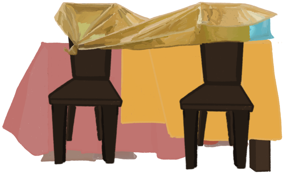 Frente a ella la mesa del comedor había desparecido, alrededor de ella había unas cobijas extendidas y a los lados las sillas estaban volteadas de manera que se podía uno sentar, pero la mesa le quedaría a uno en la espalda, y por todos los lados había cojines y cajas haciendo paredes.